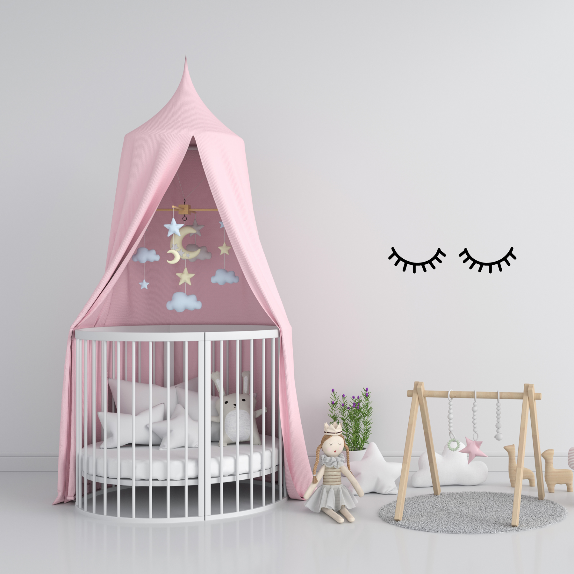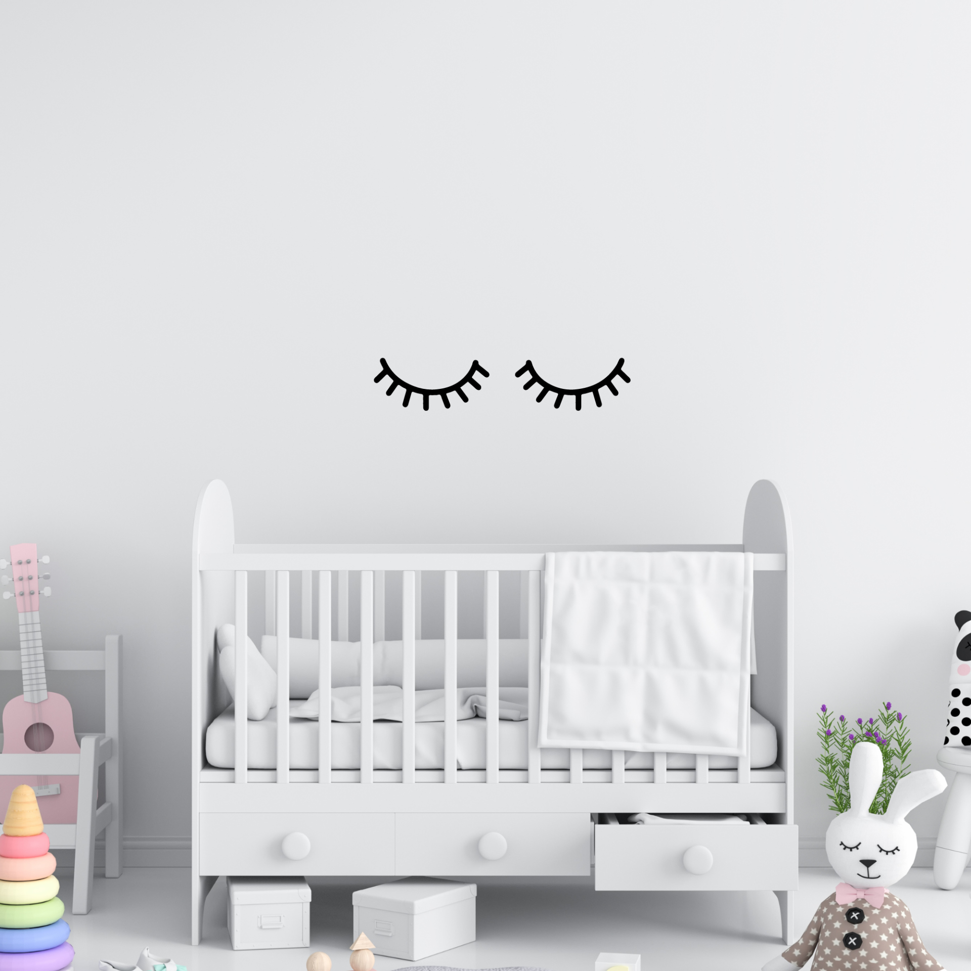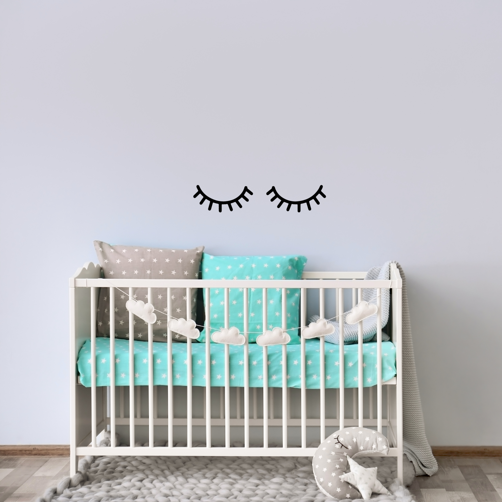 • Berço branco de bebé com decalque de pestanas negras na parede e brinquedos coloridos ao redor.