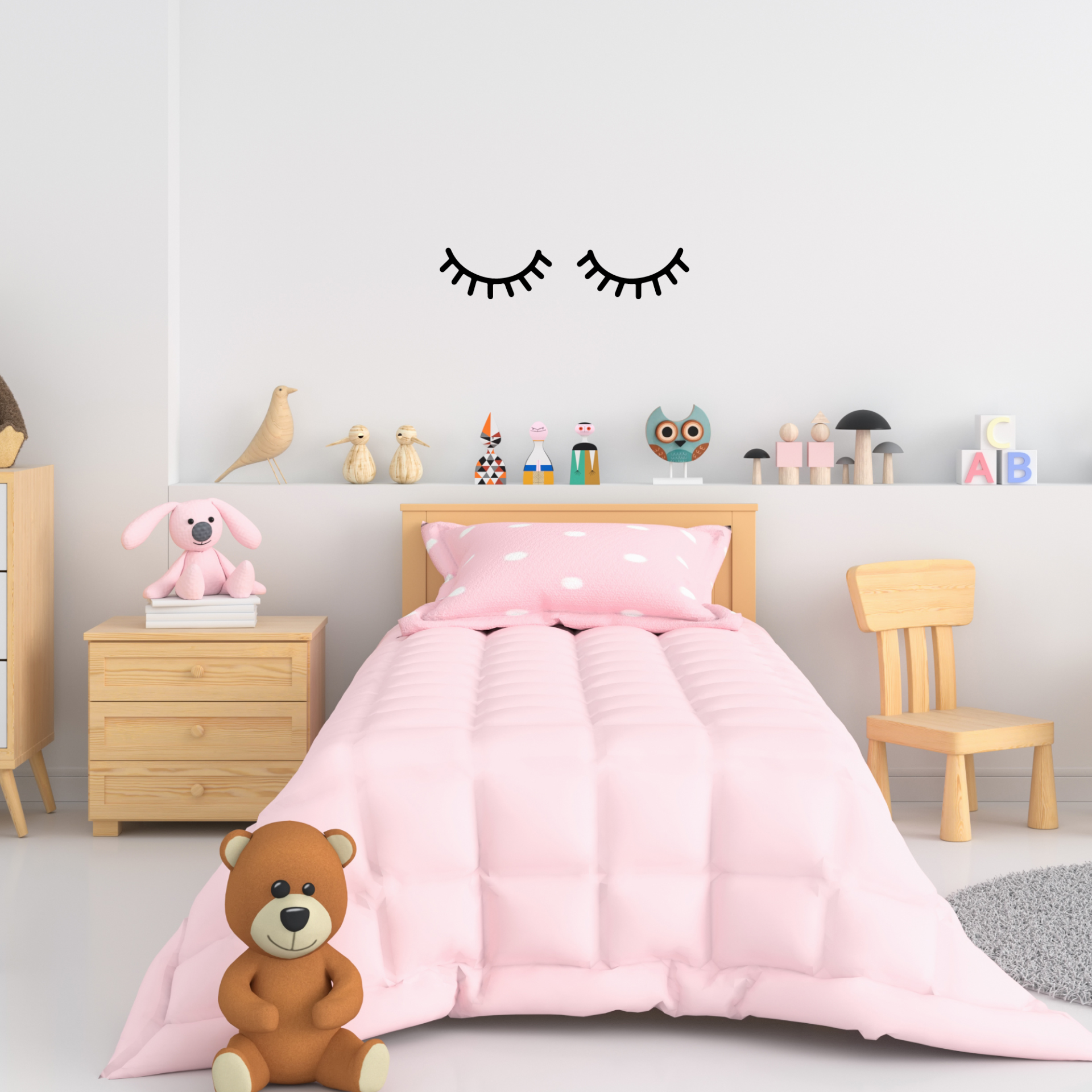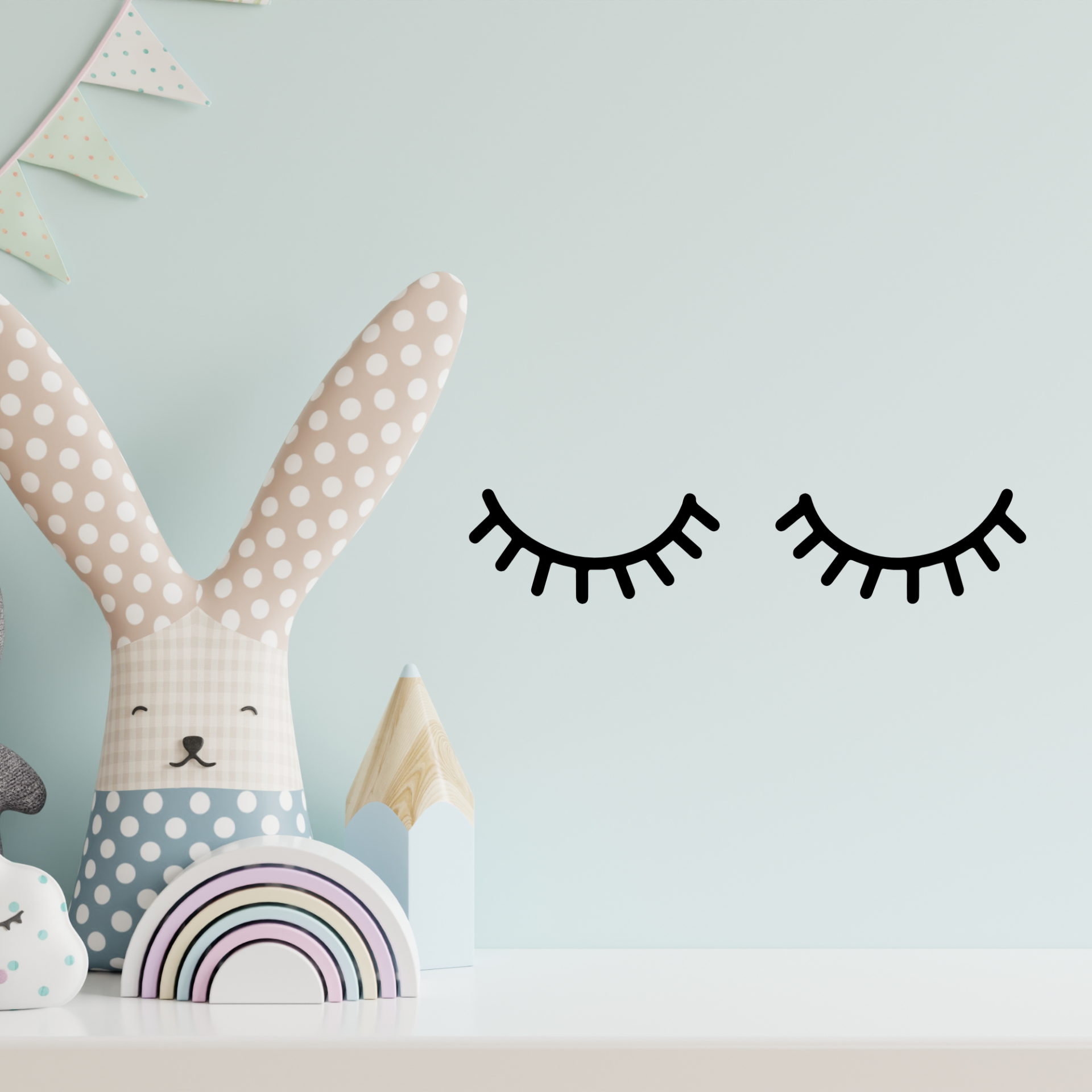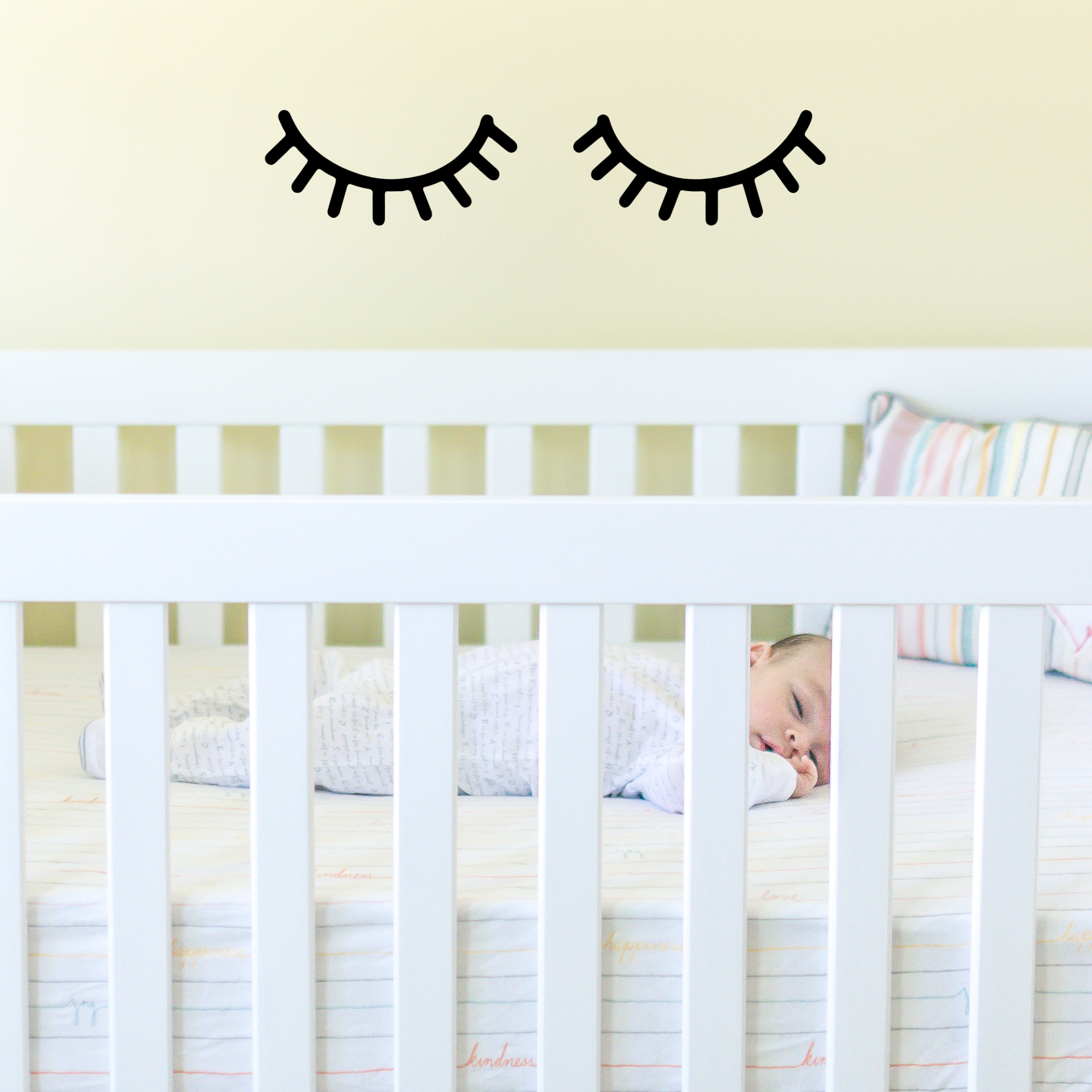 • Berço branco de bebé com decalque de pestanas negras na parede e brinquedos coloridos ao redor.